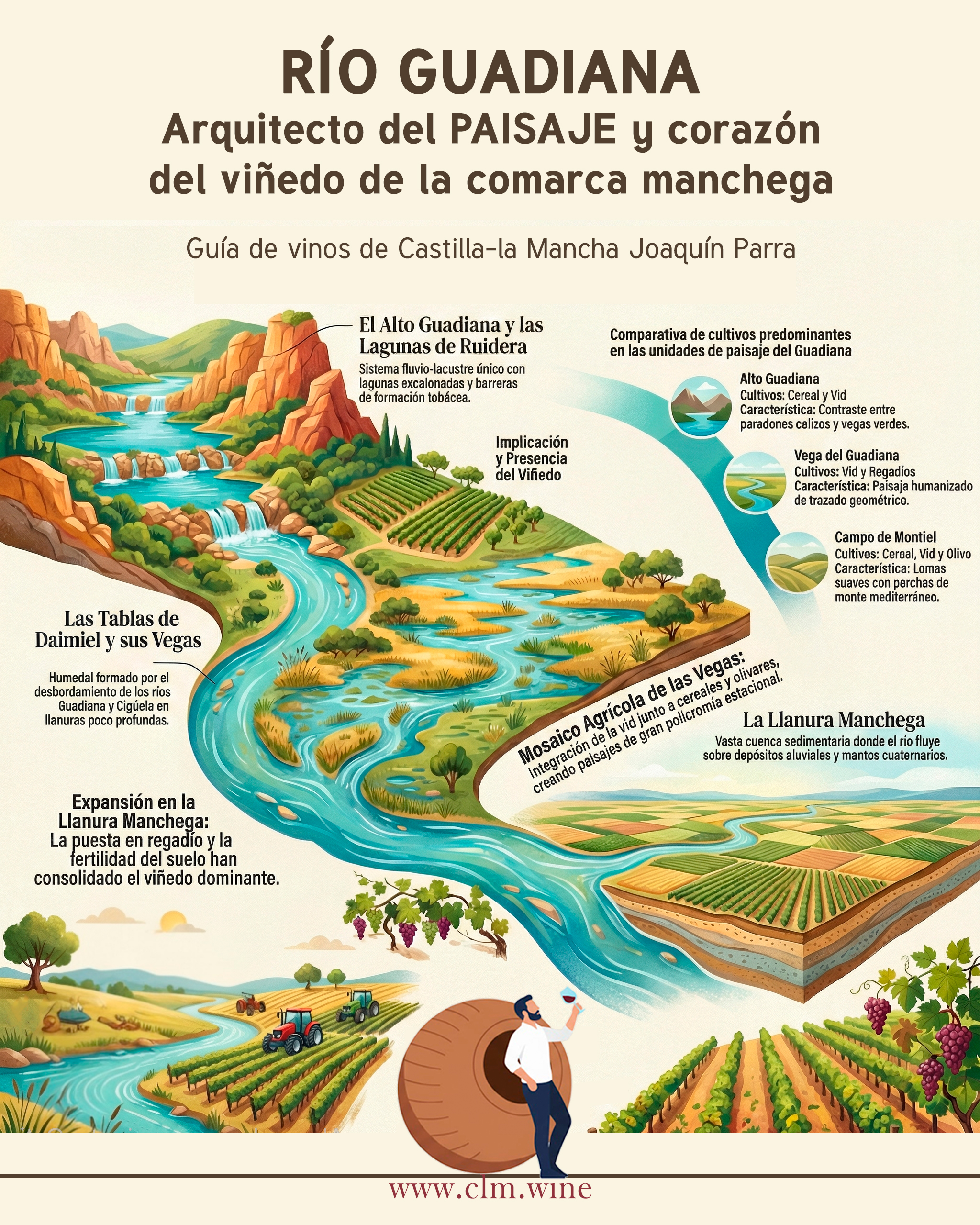 El río Guadiana entre Ruidera y Daimiel: arteria hídrica y pivote del paisaje y las aguas subterráneas de la comarca de La Mancha La viticultura en La Mancha se sustenta sobre un sistema hídrico único. El Guadiana, con sus aguas visibles y subterráneas, moldea el viñedo manchego y febrero 1, 2026 No hay comentarios