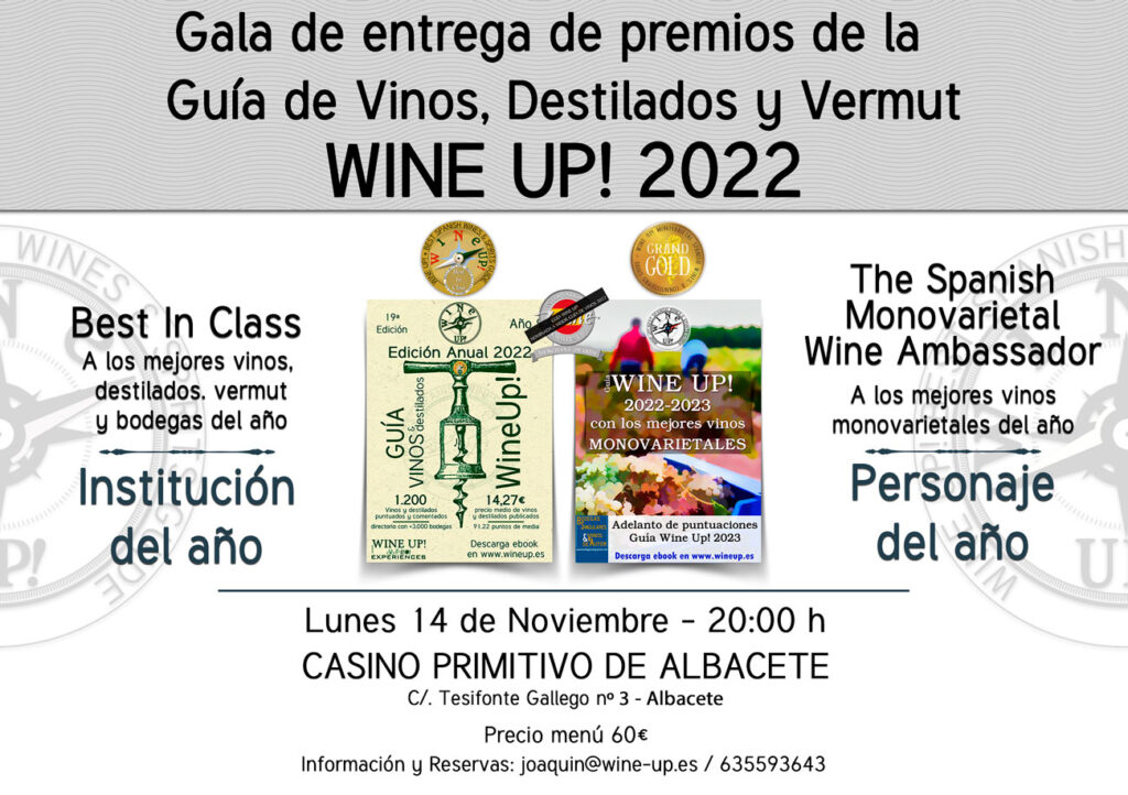 El próximo lunes 14 de noviembre se celebra en Albacete la gala de entrega de premios de la guía Wine Up! 2022. Un acto que se retoma tras el periodo de dos años por la pandemia. En la gala se hará entrega de los premios Best In Class a las mejores bodegas y vinos del año, los premios The Spanish Monovarietal Wine Ambassador, a los mejores vinos elaborados con cada variedad y el homenaje al Personaje del año e Institución del año.