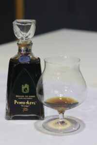 PUNTO AZUL PRESTIGE de Bodegas Yuste en Sanlúcar de Barrameda. La marca «punto azul» viene de las duelas de roble americano de mayor calidad procedentes de Costa Rica, que tradicionalmente marcaban con un punto azul. En vista intenso color caoba. En nariz destaca el recuerdo de vainilla, almendra amarga y avellana con un toque de caramelo. En boca es donde este brandy te atrapa, sedoso, untuoso, devuelve los recuerdos de nariz con persistencia.