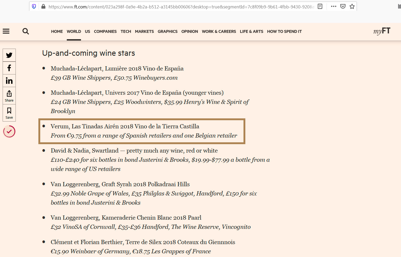 Verum Las Tinadas airén de Pie franco vuelve a llamar la atención de la crítica especializada. En este caso es el Financial Times en un artículo de Jancis Robinson sobre sus vinos de culto para el futuro en el que destaca el vino de la bodega de Tomelloso junto a otros dos de Jerez y cuatro internacionales.