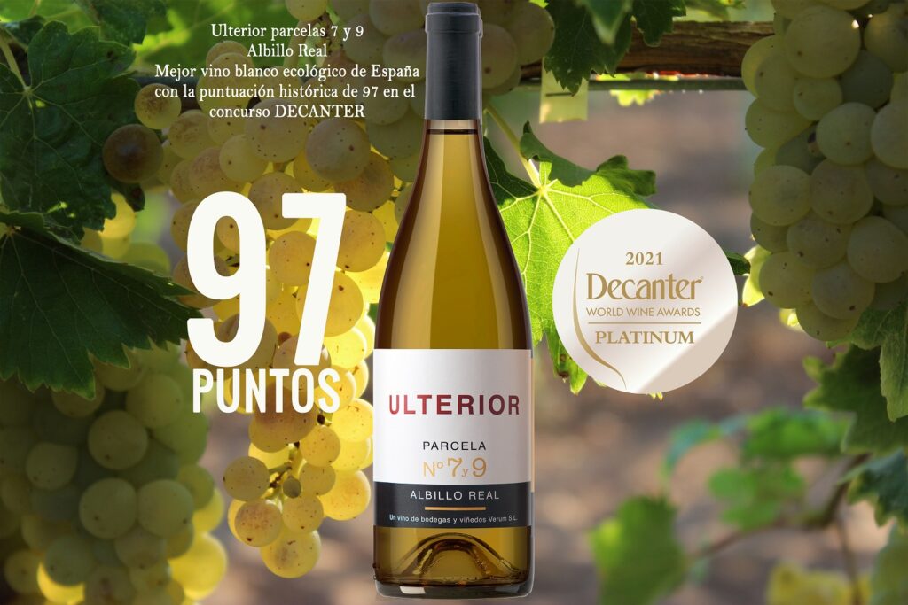 El concurso internacional DECANTER ha otorgado 97 puntos y medalla platinum a Ulterior Albillo Real parcelas 7 y 9 de Bodegas Verum, todo un hito para la bodega al estar entre los 6 mejores vinos blancos de España y obtener la puntuación más alta que jamás haya conseguido un vino blanco ecológico de nuestro país en Decanter. En la 2021 ha premiado 1840 vinos españoles de los que 379 son ecológicos.