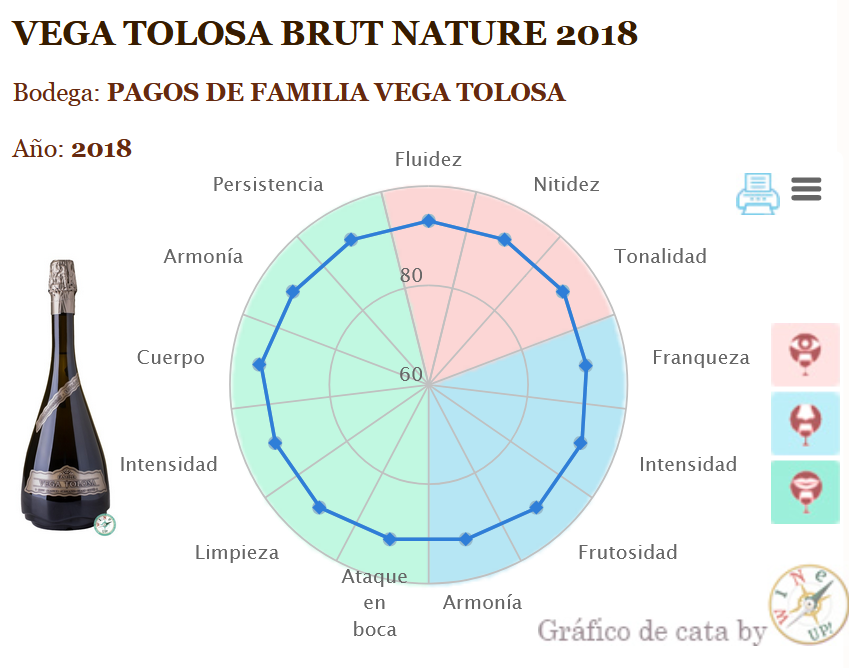 Comentario de cata: Amarillo pajizo con reflejos dorados y burbuja pequeña. En nariz sorprende su intensidad aromática con recuerdos de fruta tropical (piña madura), bollería, caramelización, frutos secos y sutil recuerdo de lía fina. En boca sorprende la acidez, fresco, intenso con una burbuja fina que deja sensación de efervescencia que llena la boca. En retrogusto es intenso y persistente, devolviendo los aromas de nariz potenciandose la piña madura o manzana asada.