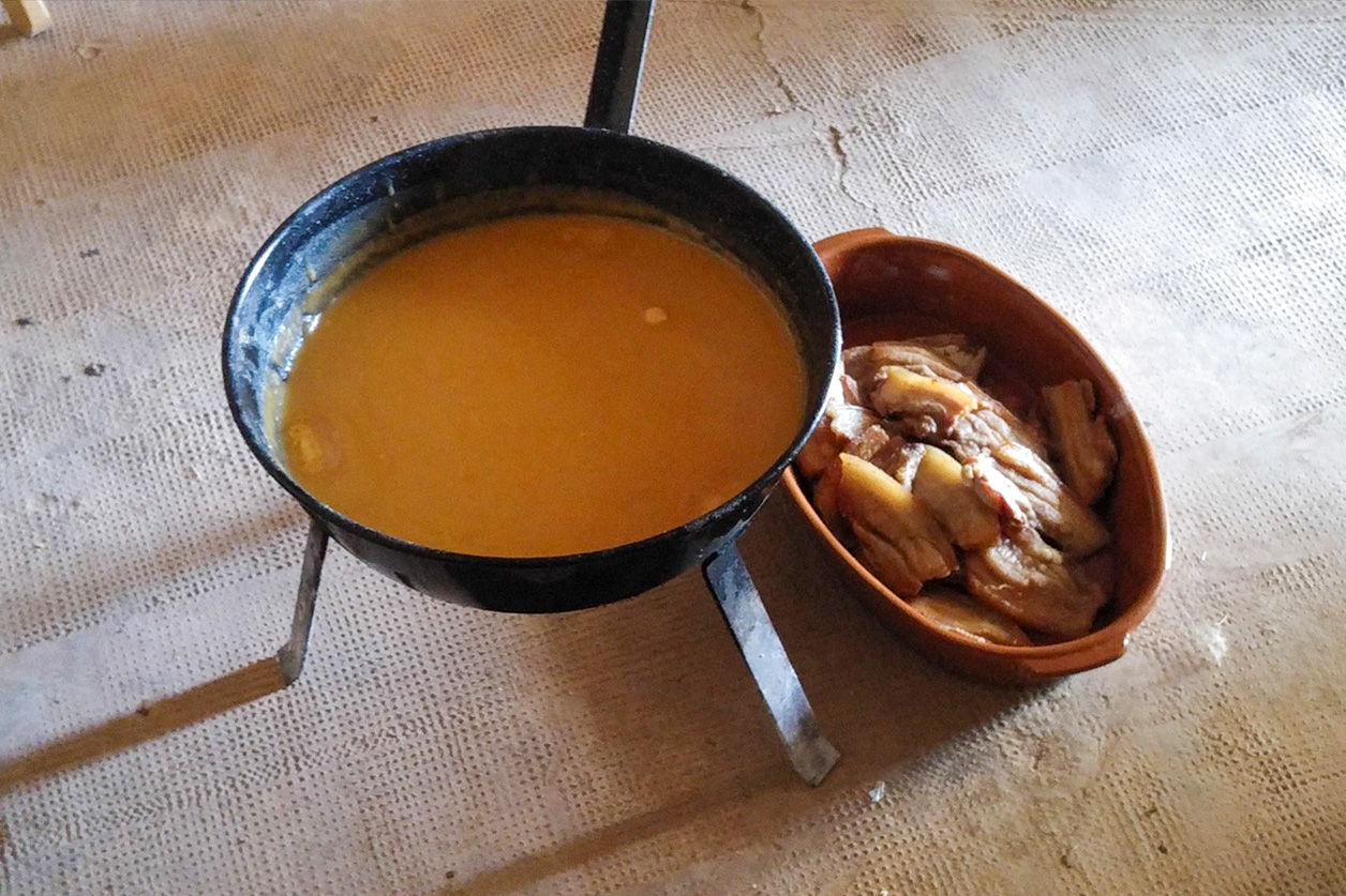 - Gachas + Orange Wine de Pies Viejos Airén. Hablar de gachas en la mancha es casi hablar de religión gastronómica. Si que es cierto que hay que ampliar el foco para que quien no es de aquí lo entienda. Las gachas no es solo una comida, es un hábito, una costumbre que se comparte, porque las gachas, se comen del perol y en compañía. Para este plato tan típico, elegí un vino y una variedad que van a la par. Hablar de airén es hacerlo de vino manchego y el estilo «orange» (macerado con las pieles) no deja de ser una recreación moderna de lo que se hacía antiguamente, cuando la turbidez del vino era lo normal.